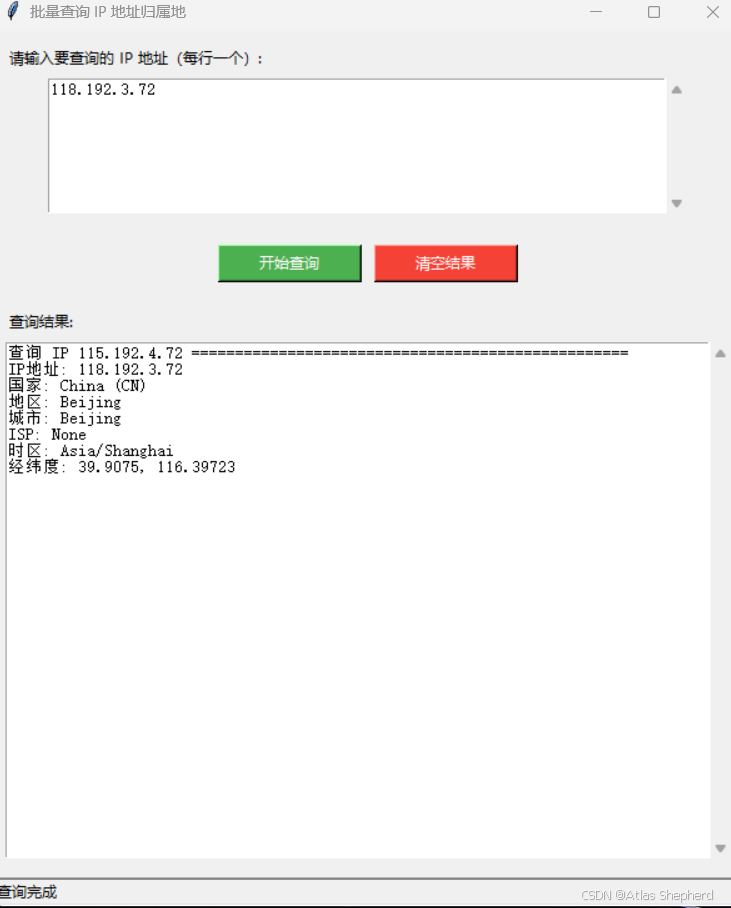 这是一个基于Python Tkinter的批量IP地址归属地查询工具。让我详细解读代码的各个部分:
