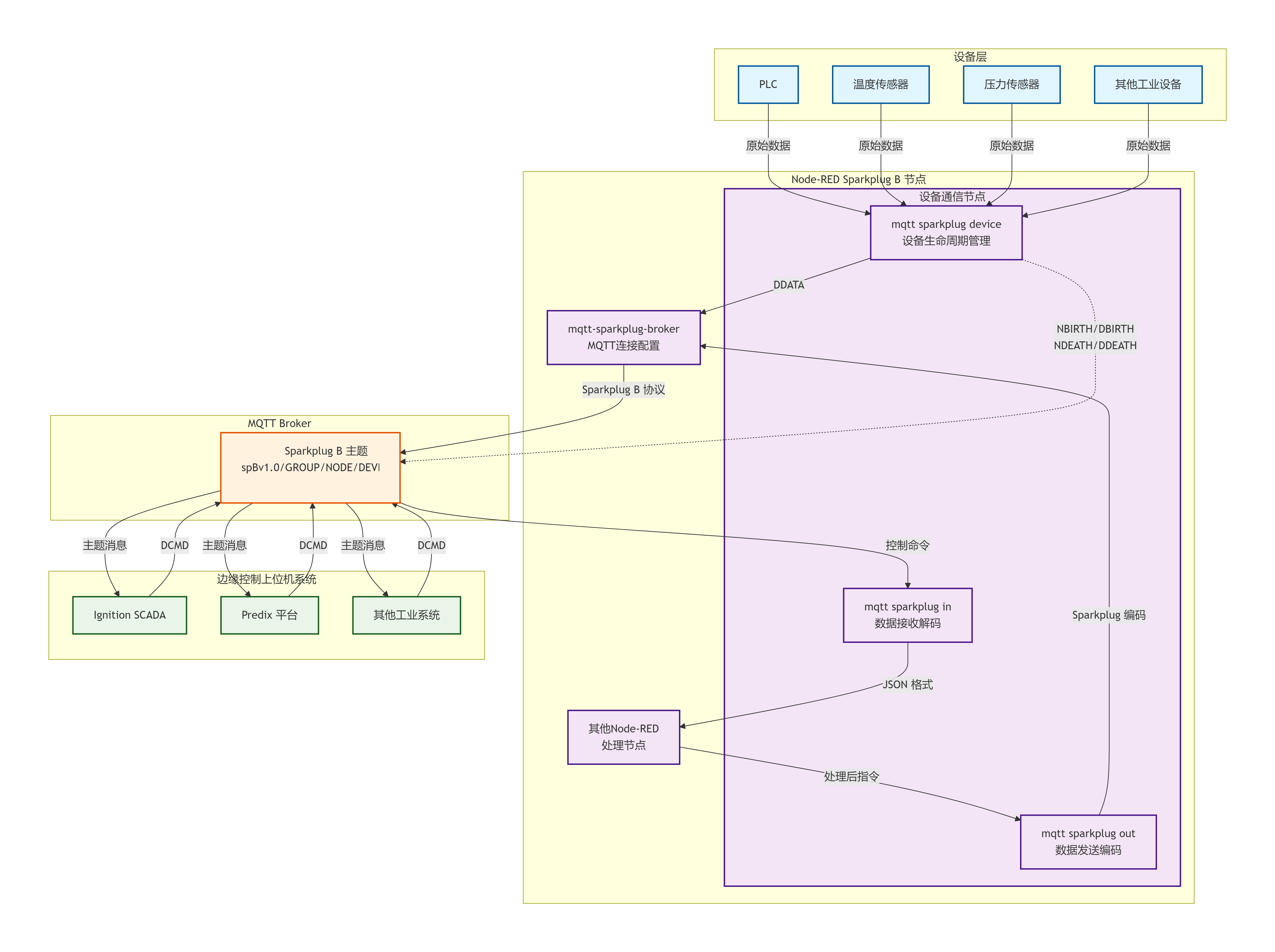Sparkplug B 协议由 Eclipse Foundation 制定,是工业自动化领域的 设备通信标准,解决了传统 MQTT 协议在设备生命周期管理、数据格式一致性和离线缓冲等场景的不足。该节点包将这一协议能力集成到 Node-RED 中,帮助开发者快速构建符合工业标准的物联网数据通道,无需手动处理复杂的协议细节(如 Protobuf 编码、消息类型定义等)。