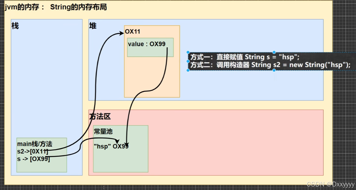方式二,先在堆中创建空间,里面维护了value属性,指向常量池的“aaaa"空间。如果常量池没有,重新创建,如果有,直接通过value指向。最终指向的是堆中的空间地址。