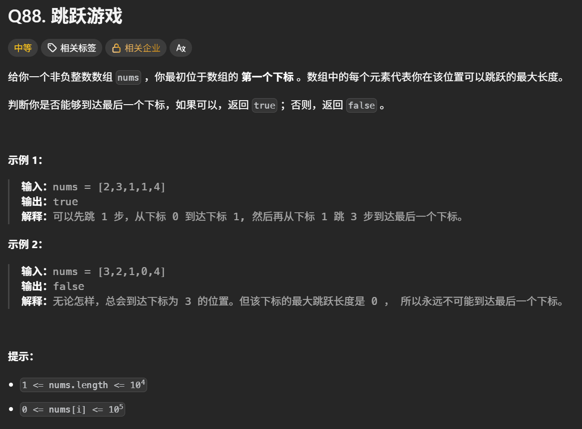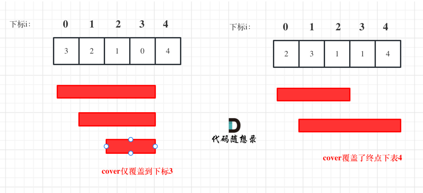思路:不要纠结当前位置元素究竟跳几步合适。以当前位置元素为3为例,也就是说,不用纠结在当前位置是跳一步、跳两步还是跳三步。而是考虑可跳的覆盖范围。每次取最大的跳跃步数,这个就是可跳的覆盖范围。只要在这个范围内,就一定可以跳过来。因此将该问题转化为跳跃覆盖范围究竟可不可以覆盖到终点。