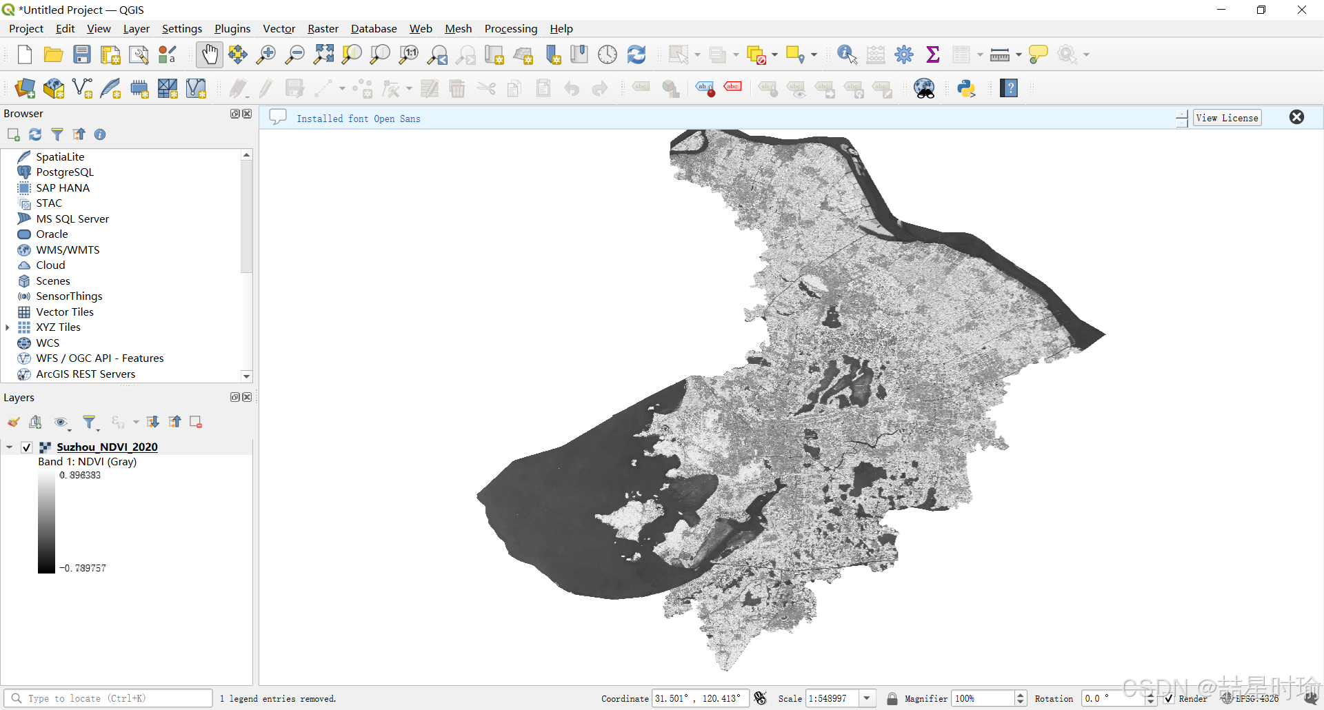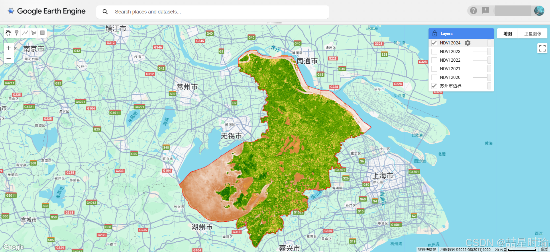 本教程的目标是利用 Google Earth Engine (GEE) 平台,提取指定行政区(以苏州市为例)在 2020–2024 年 的 NDVI(归一化植被指数)年度合成图像,并将结果导出至 Google Drive。