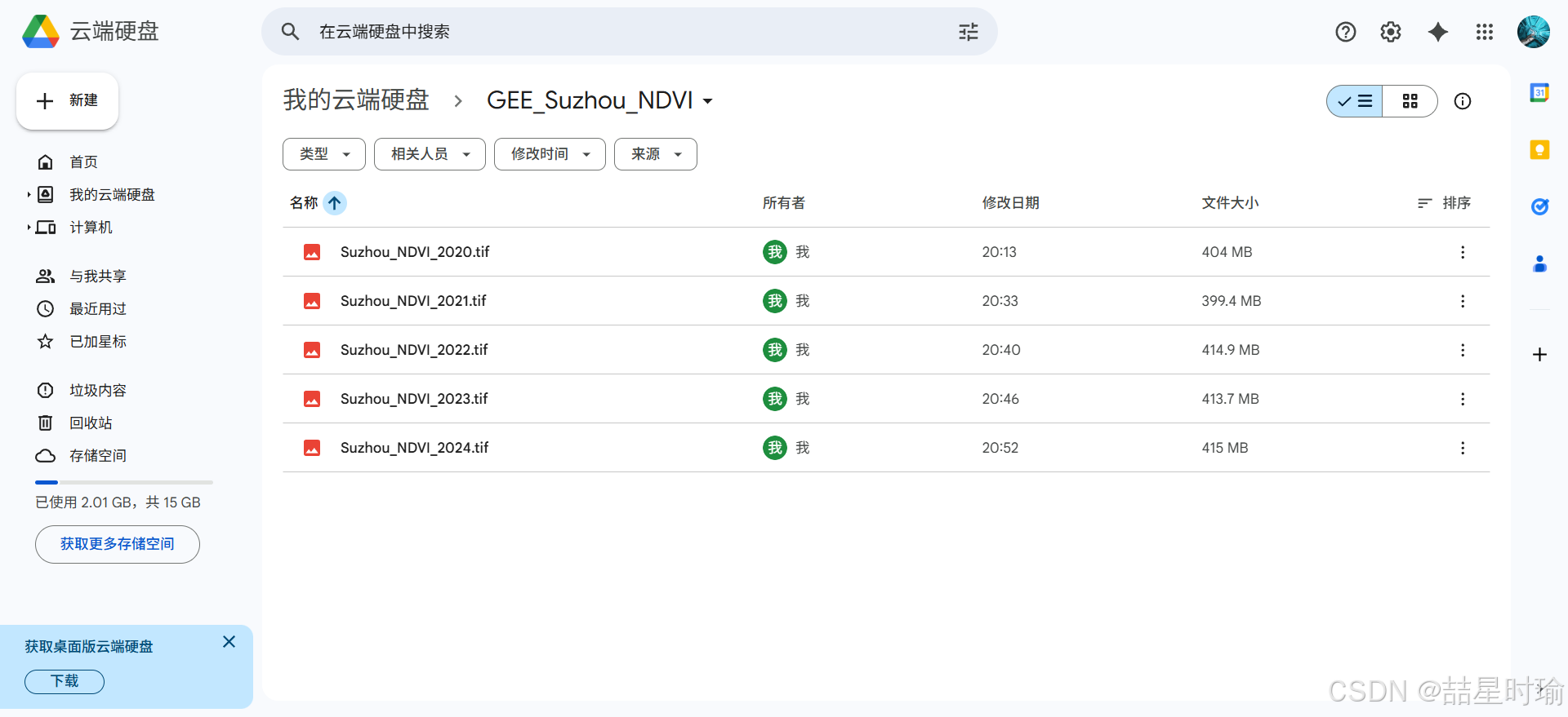 生成的 NDVI 栅格将被保存到 Google Drive 的GEE_Suzhou_NDVI文件夹中。 -