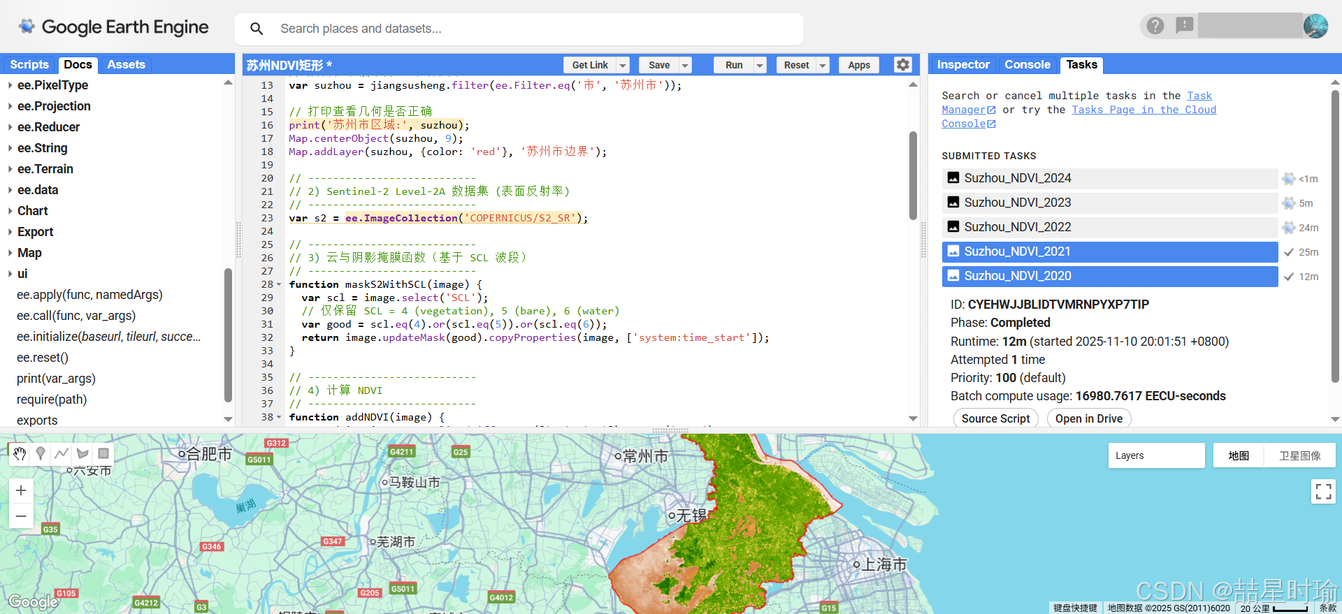 };for (var year = 2020; year <= 2024; year++) {(function(y) {var start = ee.Date.fromYMD(y, 1, 1);var end = ee.Date.fromYMD(y, 12, 31);// 选取苏州市区域内影像var col = s2.filterDate(start, end.advance(1, 'day')).filterBounds(suzhou).filter(ee.Filter.lt('CLOUDY_PIXEL_PERCENTAGE', 50)).map(maskS2WithSCL).map(addNDVI).select('NDVI');var ndviMedian = col.median().clip(suzhou);// 在地图上显示Map.addLayer(ndviMedian, visParams, 'NDVI ' + y, y === 2024 ? true : false);// 导出到 Google DriveExport.image.toDrive({image: ndviMedian,description: 'Suzhou_NDVI_' + y,folder: 'GEE_Suzhou_NDVI',fileNamePrefix: 'Suzhou_NDVI_' + y,region: suzhou.geometry(),scale: 10,crs: 'EPSG:4326',maxPixels: 1e13});})(year);