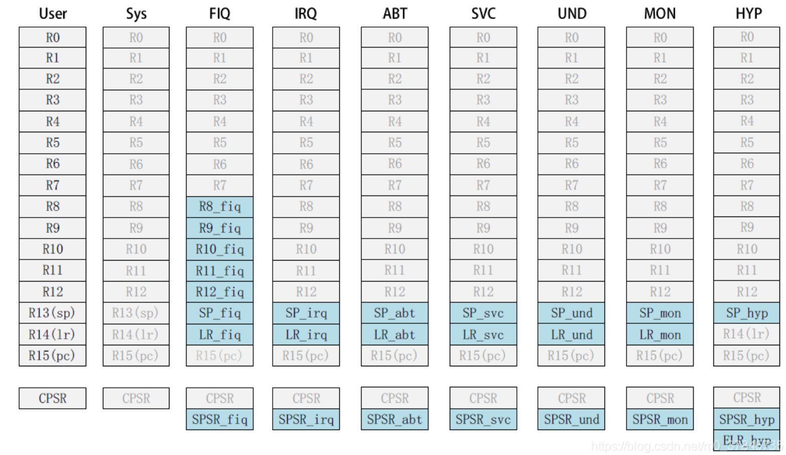 2、R0-R12、R13(SP)、R14(LR)、R5(PC)、CPSR、SPSR都是寄存器的编号