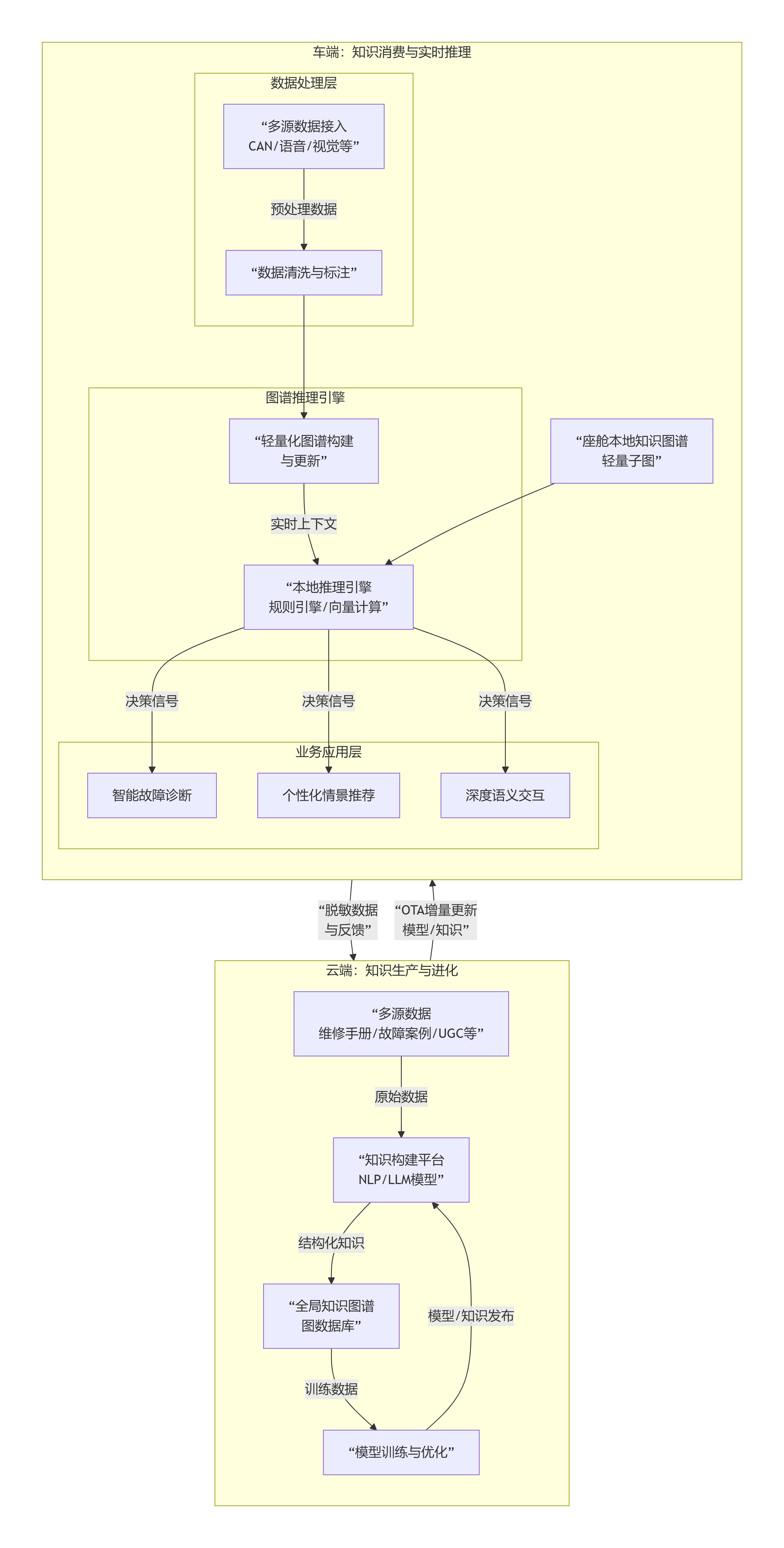 本方案旨在构建一个 “车端实时感知决策、云端持续进化赋能” 的下一代智能座舱大脑。其核心在于将知识图谱技术与车端算力、多模态数据深度融合,使座舱从被动的功能执行者,转变为具备上下文理解、个性化推理与主动服务能力的出行伙伴。