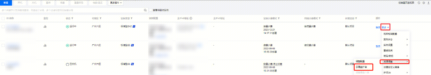 https://console.cloud.tencent.com/cvm/index ,选择目标实例 -> 【更多】->【资源调整】->【云硬盘扩容】,按指引设置目标容量并确认