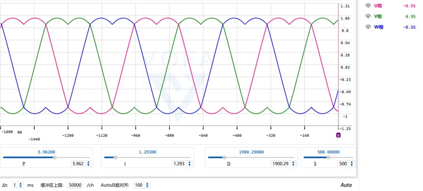 这里因为是开环控制,所以没法闭环Ud。将Ud设置为0,Ud设置为满幅值,即可得到上面的波形。控制Uq的大小,只需要对波形整体做高度上的缩放即可。