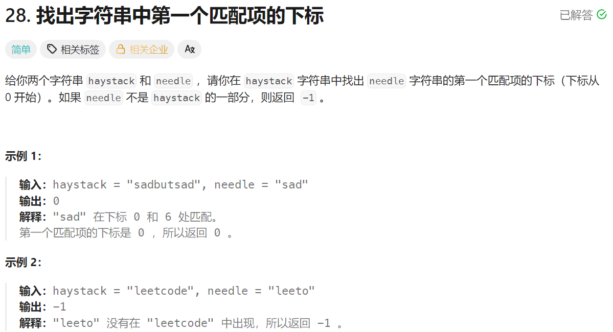 public:int strStr(string haystack, string needle) {vector<int>next(needle.size(),0);for(int i=1,j=0;i<needle.size();i++){while(j>0&&needle[i]!=needle[j]){j=next[j-1];}if(needle[i]==needle[j])j++;next[i]=j;}for(int i=0,j=0;i<haystack.size();i++){while(j>0&&haystack[i]!=needle[j]){j=next[j-1];}if(haystack[i]==needle[j])j++;if(j==needle.size())return i+1-j;}return -1;}