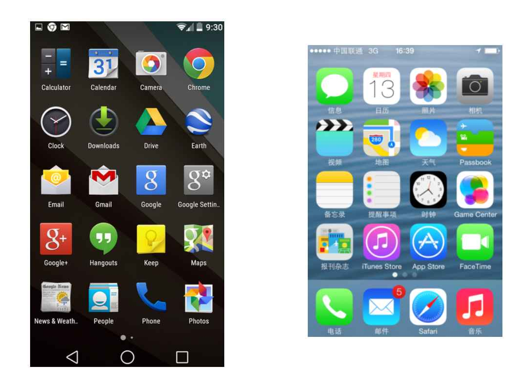 如下是 Android 手机图形用户界面和 IOS 手机图形用户界面: