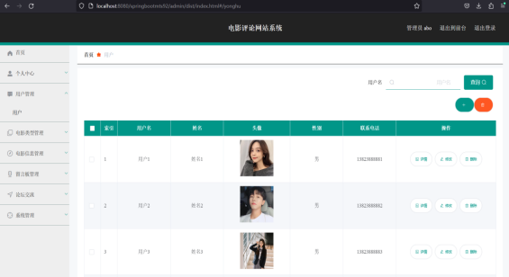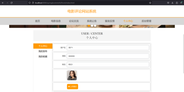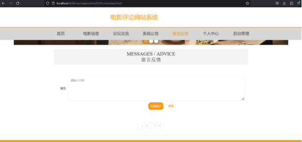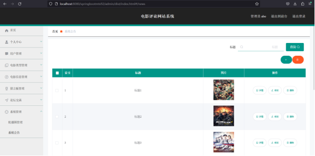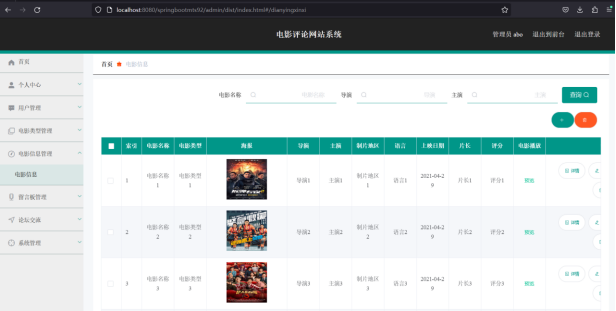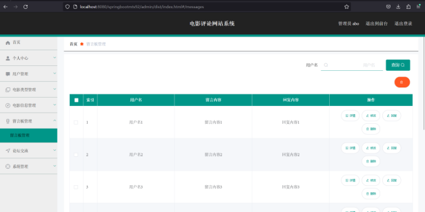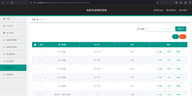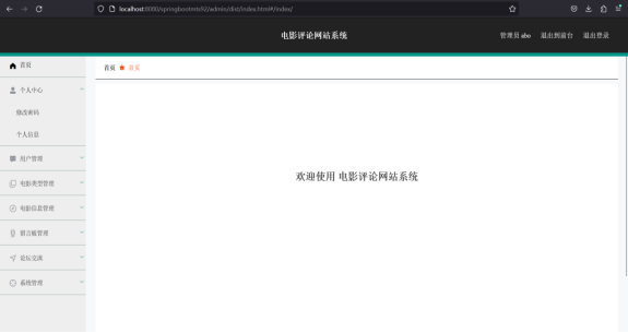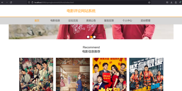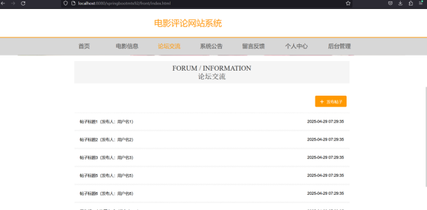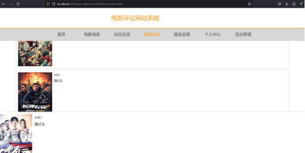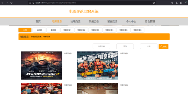 完成系统的功能实现,重点包括电影信息展示、用户评论互动、论坛交流、留言反馈等模块。系统的实现部分以Spring Boot为核心,通过前后端分离的方式,将MySQL数据库、HTML、CSS等技术相结合,实现良好的用户界面和高效的后台数据处理。