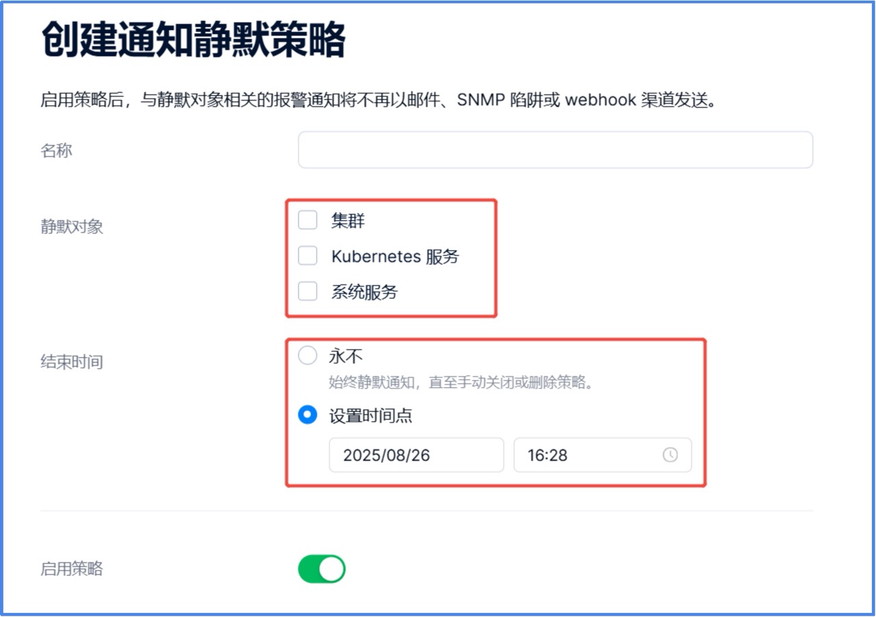 | 静默策略 | 在设定周期内屏蔽与静默对象相关的报警通知,降低噪音 |