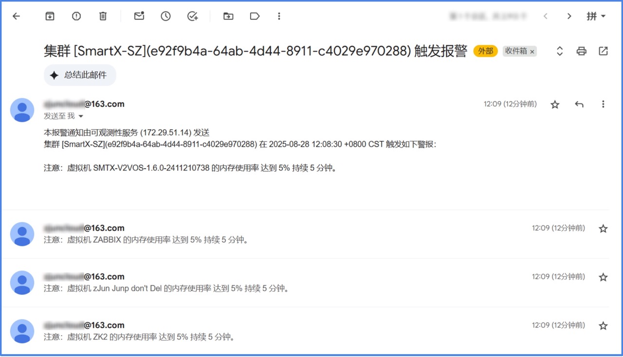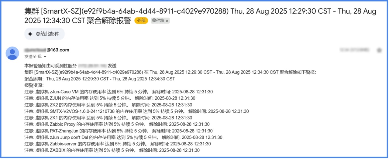 用户配置了聚合策略,将集群告警设置了 5 分钟的聚合周期。当类似的网络异常再次发生时,平台并没有每触发一次告警就推送一封邮件,而是将 5 分钟内同一规则的触发或解决事件统一收敛为两个报警通知(触发/解决)推送给运维人员。