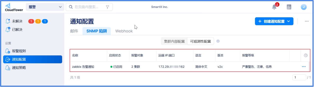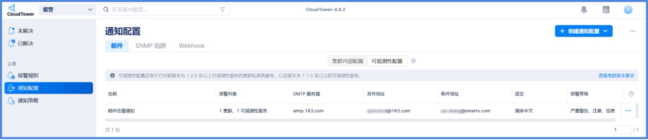 部署完可观测性平台后,在 CloudTower 中启用邮件、SNMP Trap、Webhook 告警通知,只需简单几步: