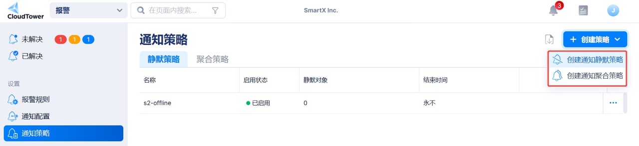 1. 在 CloudTower 的报警主界面左侧的导航树单击通知策略,然后在通知策略界面右上角单击创建策略 > 创建通知静默/聚合策略,将弹出创建通知静默/聚合策略对话框。