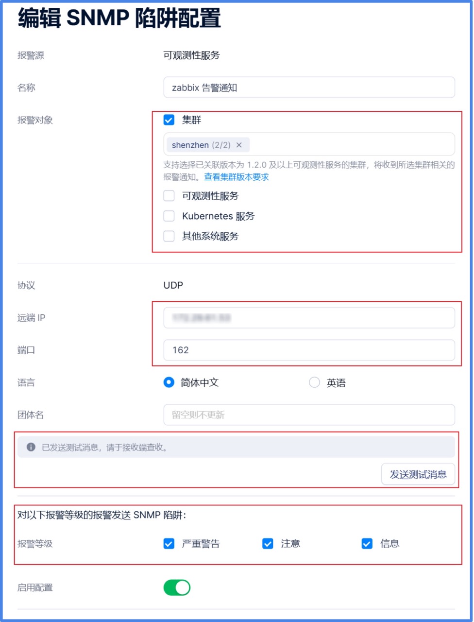 a. 选择可观测性服务作为报警源。设置 SNMP 陷阱配置的名称。选择报警对象。填写 SNMP 陷阱配置信息。选择触发 SNMP 陷阱的报警等级,并启用配置。单击创建,完成配置。