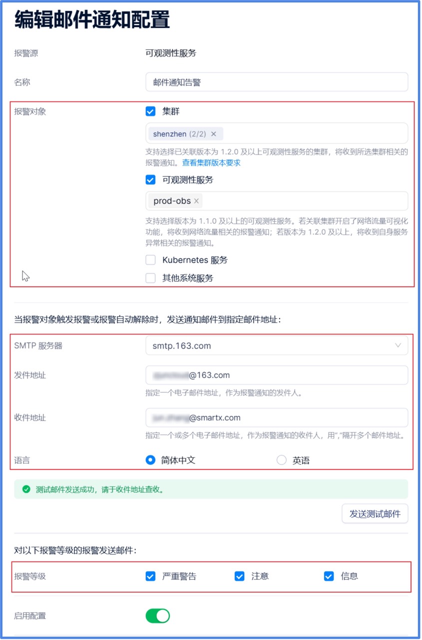 a. 选择可观测性服务或集群内部作为报警源。设置邮件通知配置的名称。选择报警对象。设置发送报警通知的 SMTP 服务器、发件地址、收件地址和通知语言。选择触发邮件通知的报警等级,并启用配置。单击创建,完成配置。