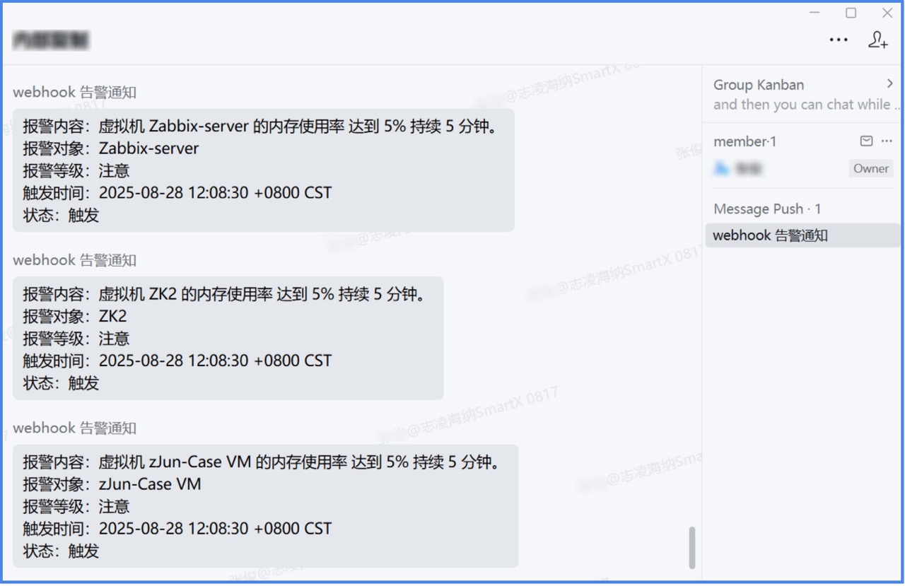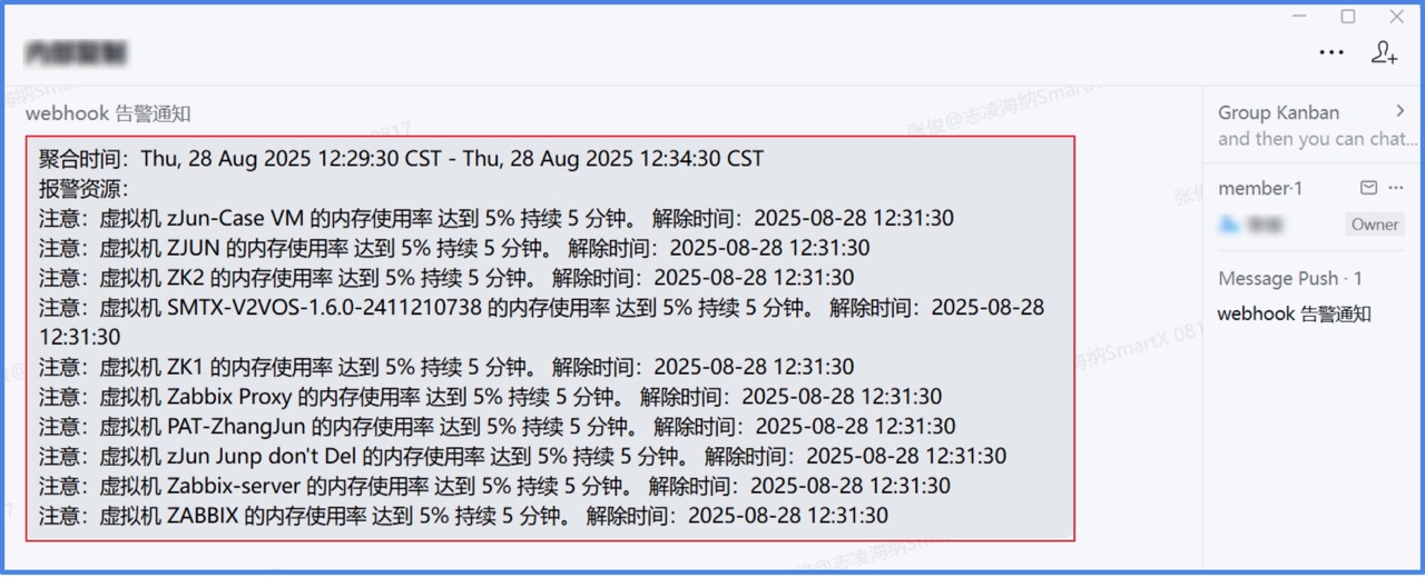 许多企业已经拥有成熟的监控系统(如 Zabbix),并希望将告警系统接入日常办公软件(如企业微信、钉钉、飞书)。若虚拟化平台仅支持在自身管理界面或邮箱中查看告警信息,就会形成“告警孤岛”。
