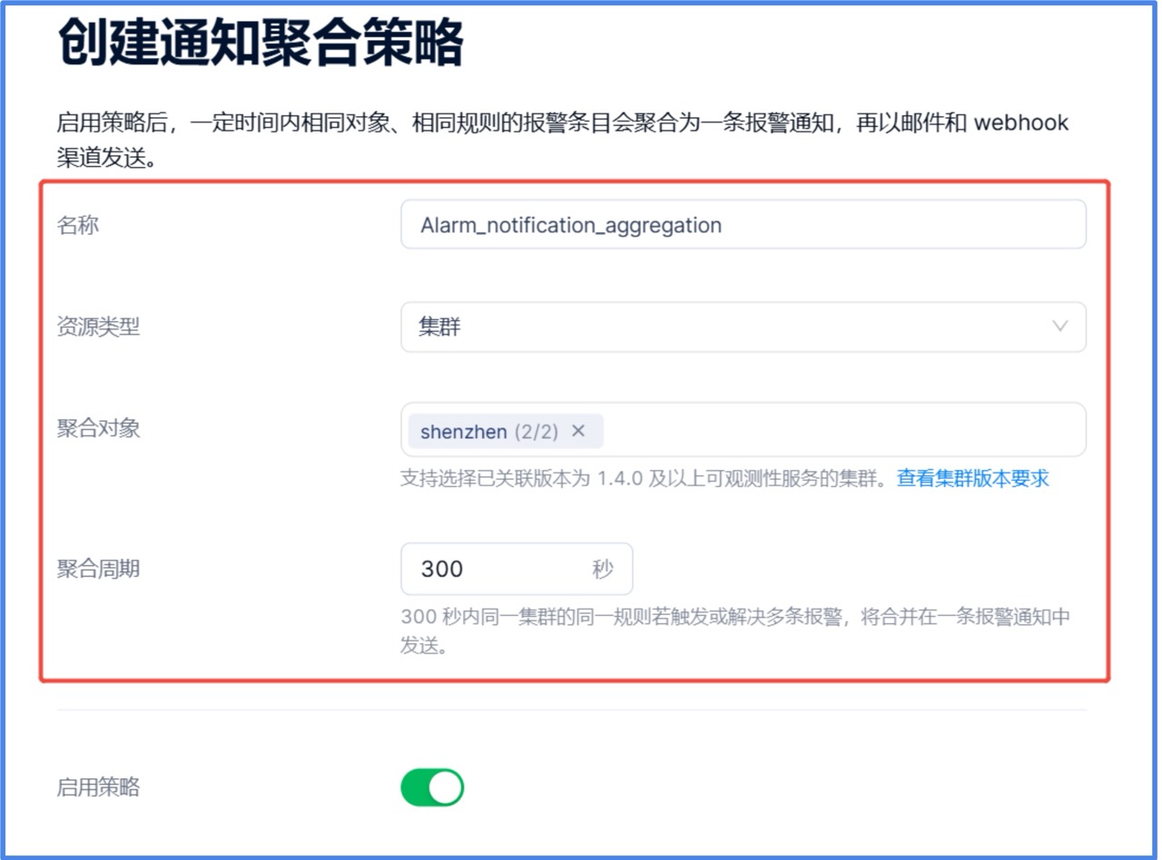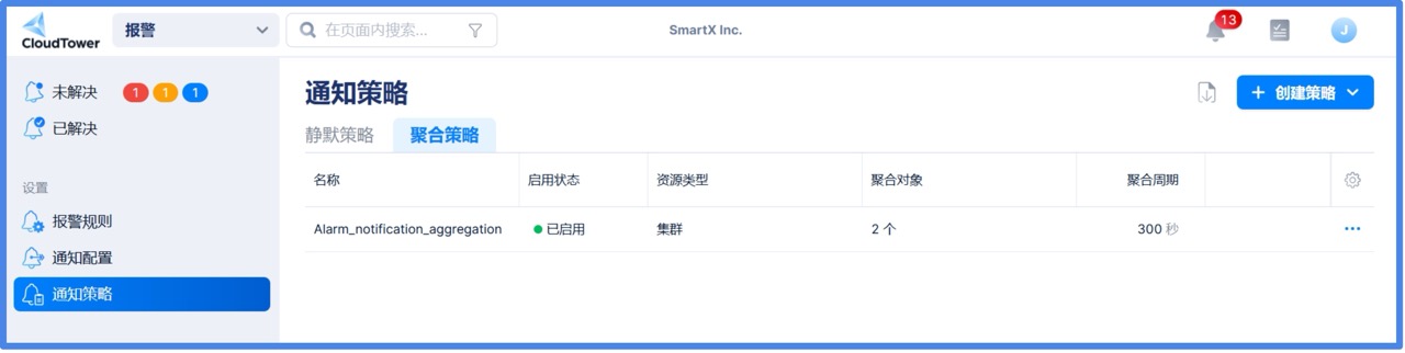 | 聚合策略 | 将相同对象、相同规则的报警通知聚合为一条报警通知,减少重复提醒 |