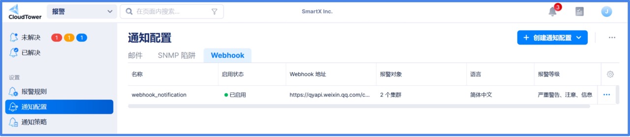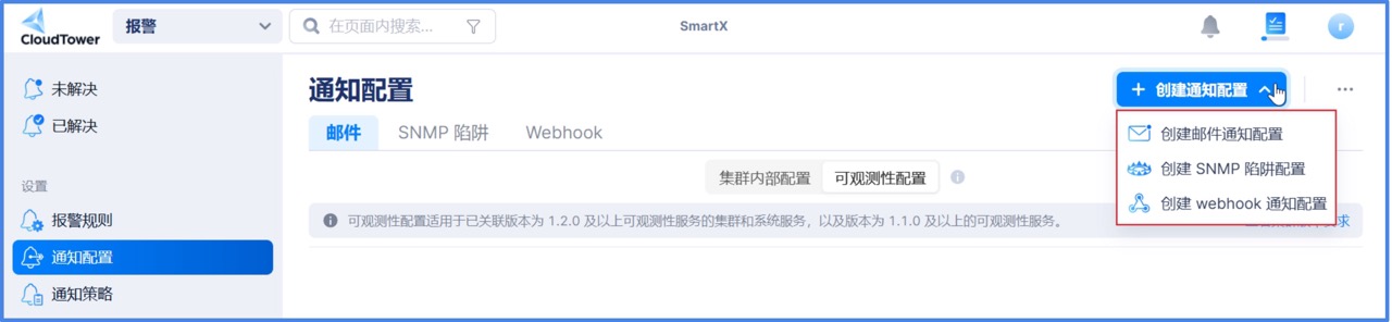 1. 在 CloudTower 报警主界面左侧的导航树选择通知配置,单击右上角创建通知配置,选择创建邮件通知配置 / 创建 SNMP 陷阱配置 / 创建 webhook 通知配置,进入相应配置界面。