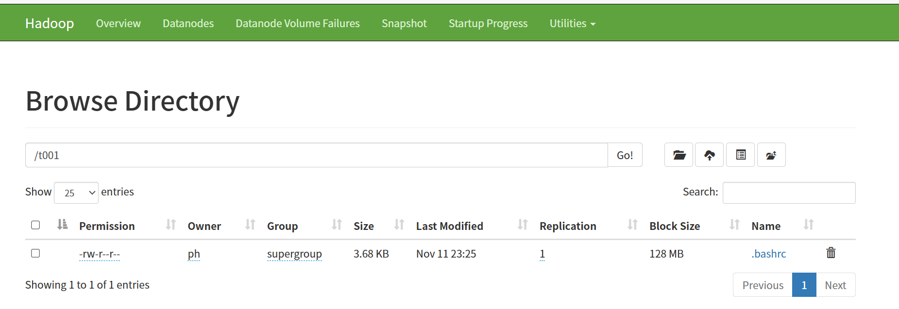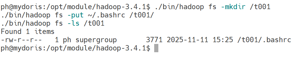 ./bin/hadoop fs -mkdir /t001 ./bin/hadoop fs -put ~/.bashrc /t001/ ./bin/hadoop fs -ls /t001