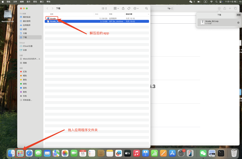 下载后进行解压,将解压的Xcode App拉到程序集,安装完成。