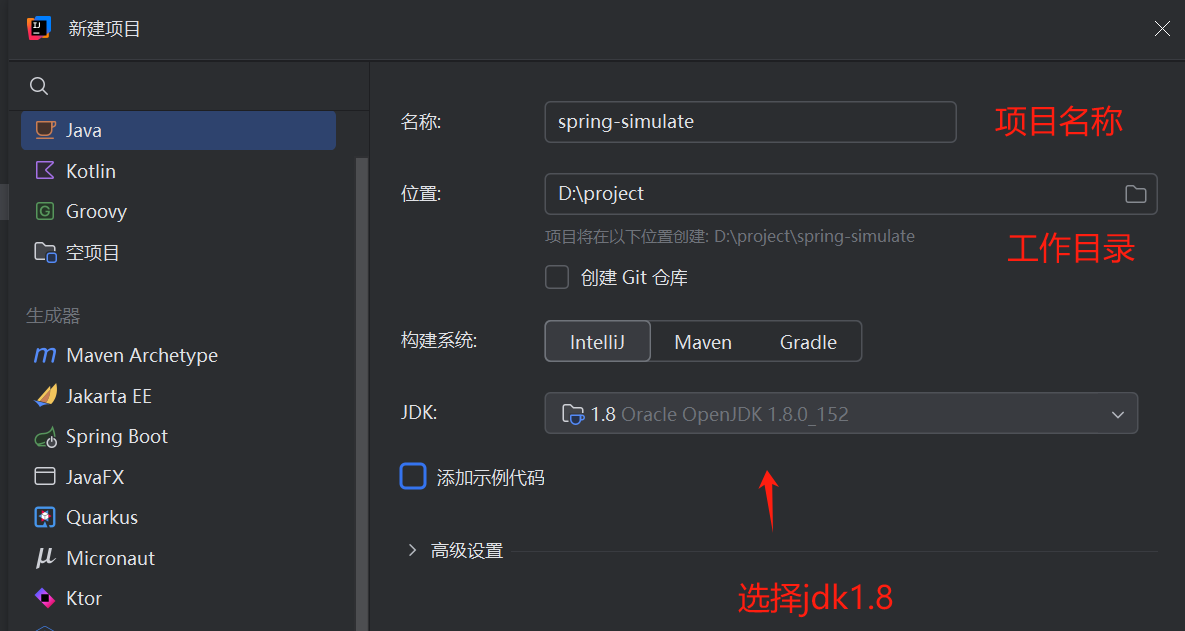 3.选择java,更改项目名称、工作目录和JDK版本,然后点击下一步