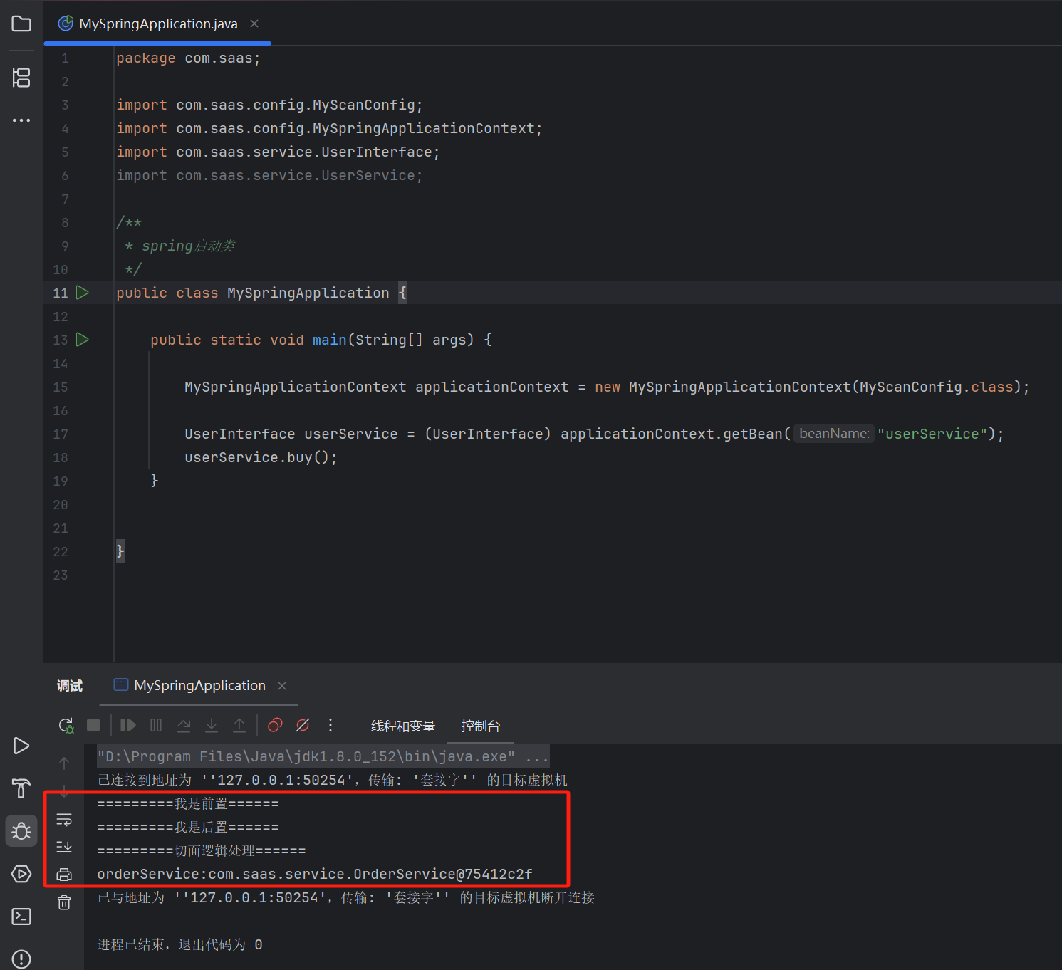 public class MySpringApplication {public static void main(String[] args) {MySpringApplicationContext applicationContext = new MySpringApplicationContext(MyScanConfig.class);UserInterface userService = (UserInterface) applicationContext.getBean("userService");userService.buy();}}