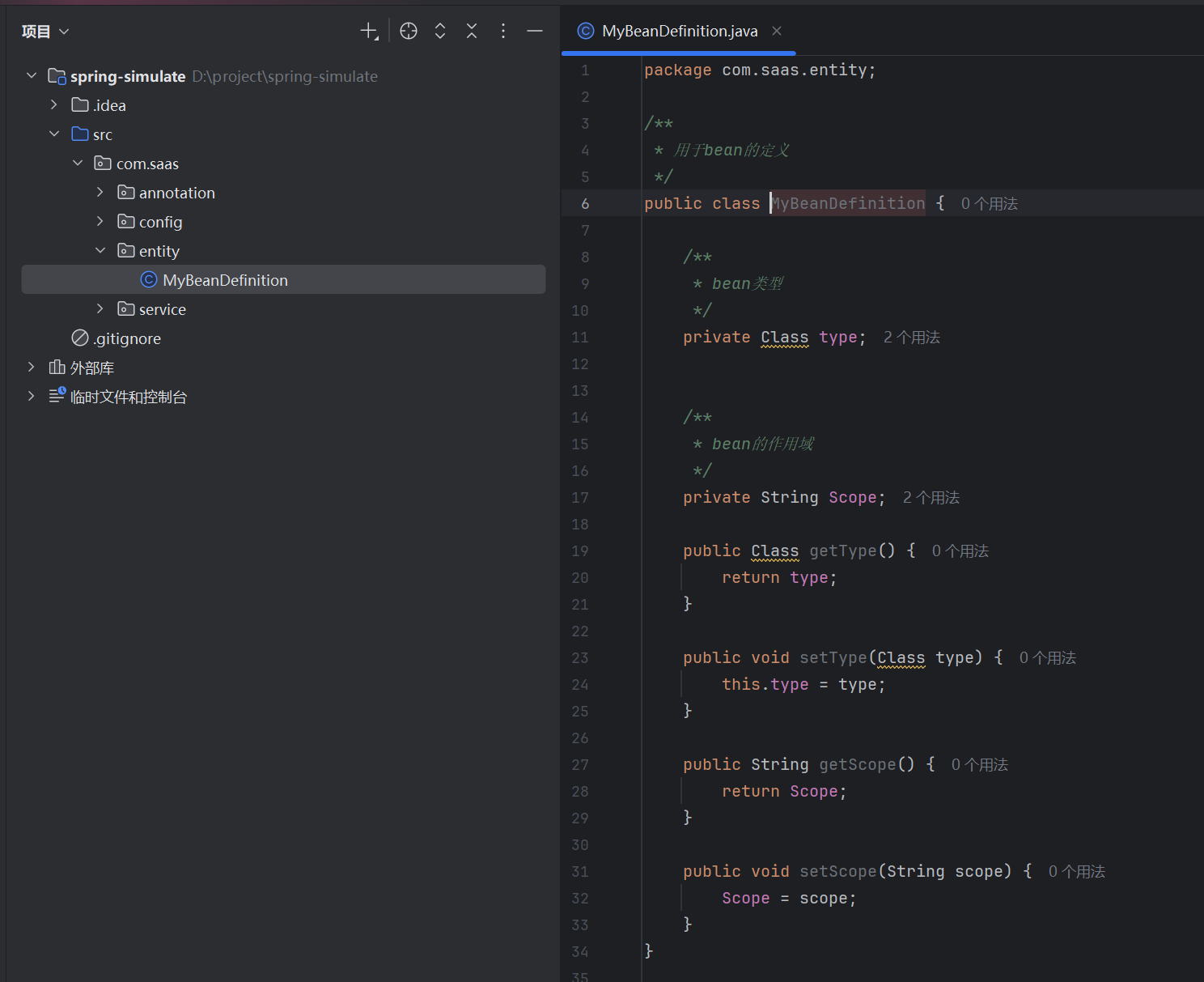 public class MyBeanDefinition {/*** bean类型*/private Class type;/*** bean的作用域*/private String Scope;public Class getType() {return type;}public void setType(Class type) {this.type = type;}public String getScope() {return Scope;}public void setScope(String scope) {Scope = scope;}