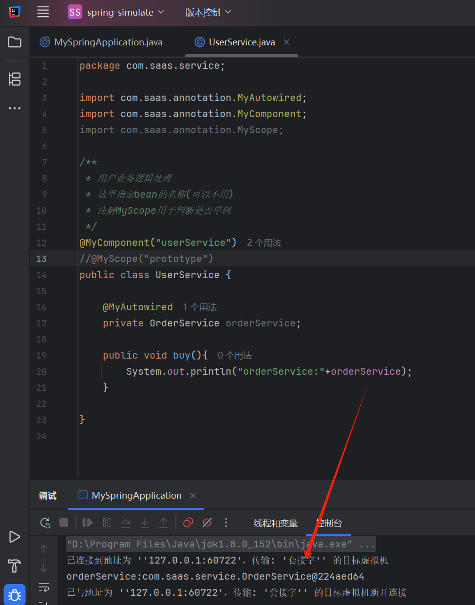 public class UserService {@MyAutowiredprivate OrderService orderService;public void buy(){System.out.println("orderService:"+orderService);}}