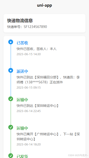 </template><script>export default {data() {return {expressList: [{title: "已签收",desc: "快件已签收,签收人:本人",time: "2023-06-15 14:30",status: "active"},{title: "派送中",desc: "快件已到达【深圳福田分部】,快递员:李师傅(138****5678)正在派件",time: "2023-06-15 09:15",status: "active"},{title: "运输中",desc: "快件已到达【深圳转运中心】",time: "2023-06-14 22:45",status: "completed"},{title: "运输中",desc: "快件已离开【广州转运中心】,下一站【深圳转运中心】",time: "2023-06-14 18:20",status: "completed"},{title: "已发货",desc: "商家已发货",time: "2023-06-13 16:10",status: "completed"},{title: "已下单",desc: "您的订单已提交成功",time: "2023-06-12 10:30",status: "completed"}]};}};