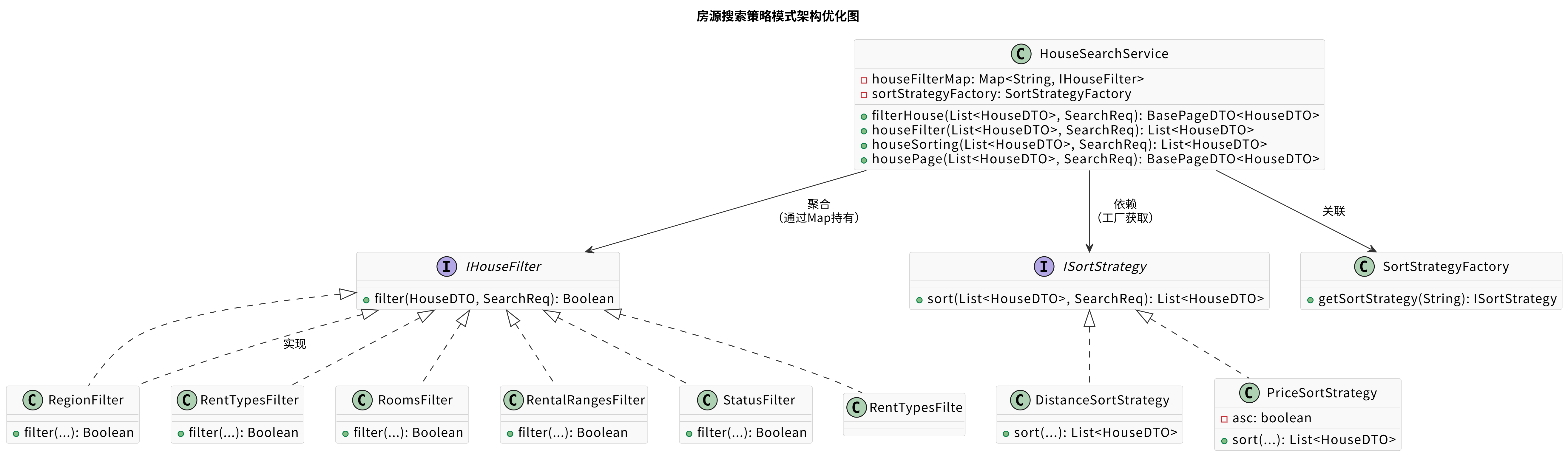houseSorting方法) 只需要传入sortType,即可获得正确的策略对象,无需关心具体实现类的创建细节。 - 易于扩展:新增排序策略只需在