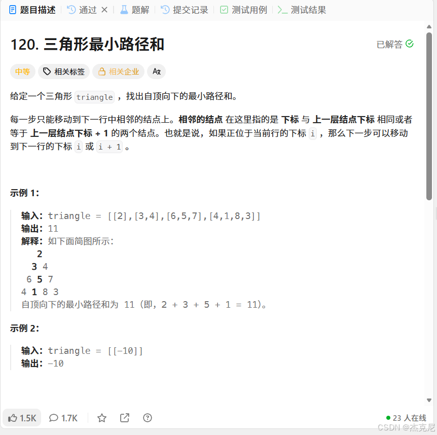 class Solution {public int minimumTotal(List<List<Integer>> triangle) {int n = triangle.size();// dp[i][j] 表示从顶部到第 i 行第 j 列的最小路径和int[][] dp = new int[n][n];// 初始化顶部节点dp[0][0] = triangle.get(0).get(0);for (int i = 1; i < n; i++) {// 处理最左列:只能从正上方过来dp[i][0] = dp[i-1][0] + triangle.get(i).get(0);// 处理中间列:从左上方或正上方取最小值for (int j = 1; j < i; j++) {dp[i][j] = Math.min(dp[i-1][j-1], dp[i-1][j]) + triangle.get(i).get(j);}// 处理最右列:只能从左上方过来dp[i][i] = dp[i-1][i-1] + triangle.get(i).get(i);}// 遍历最后一行,找最小值int minTotal = dp[n-1][0];for (int j = 1; j < n; j++) {minTotal = Math.min(minTotal, dp[n-1][j]);}return minTotal;}