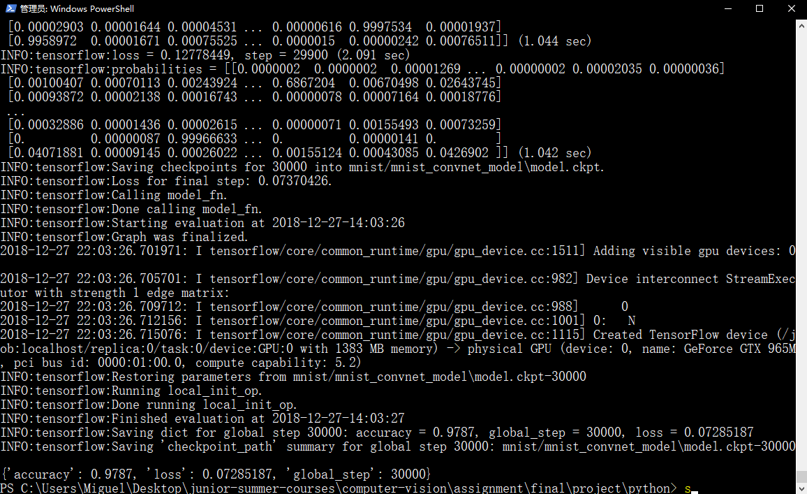 在搭载 GTX 965M的 Windows 笔记本下进行MNIST数据集训练结果,准确率为97.87%: