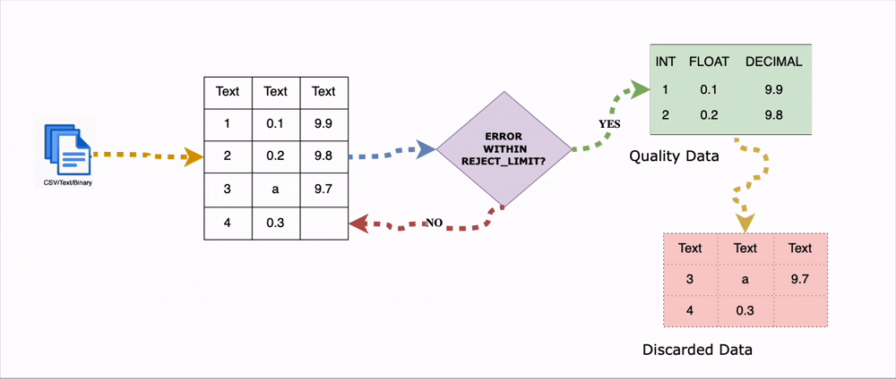 如果我们需要控制错误的行并仅在限制范围内接受它,REJECT_LIMIT有助于实现它。它适用于on_error选项。