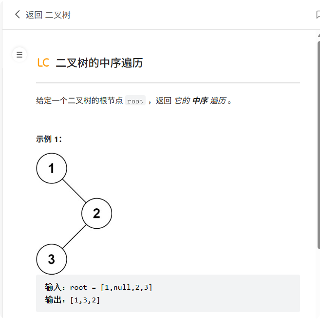 首先我们需要了解什么是二叉树的中序遍历:按照访问左子树——根节点——右子树的方式遍历这棵树,而在访问左子树或者右子树的时候我们按照同样的方式遍历,直到遍历完整棵树。因此整个遍历过程天然具有递归的性质,我们可以直接用递归函数来模拟这一过程。