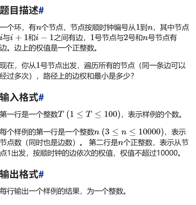 思路:想通了就很简单,由样例一可知,遍历时可以折返,那我们就想什么时候要折返才能使边权和最小呢,那就是当已经遍历过的节点的边权和小于接下来要顺时针遍历的边权和,以下是我的原始的错误的代码,因为我当时想当然的以为一定是遇见最大的边权后才会折返,但其实这么想就错了