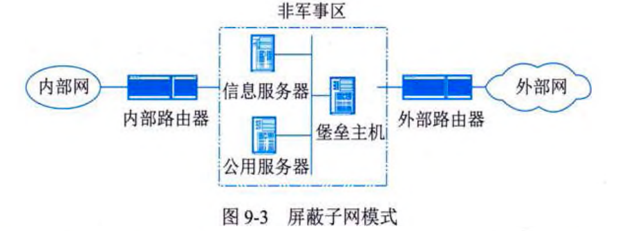 - 组成:采用两个包过滤路由器和一个堡垒主机,在内外网络之间建立一个被隔离的子网(称为非军事区(DMZ)或边界网络)。