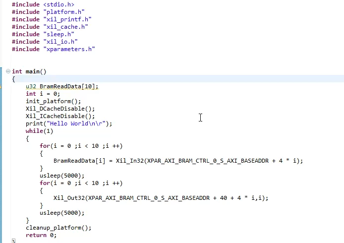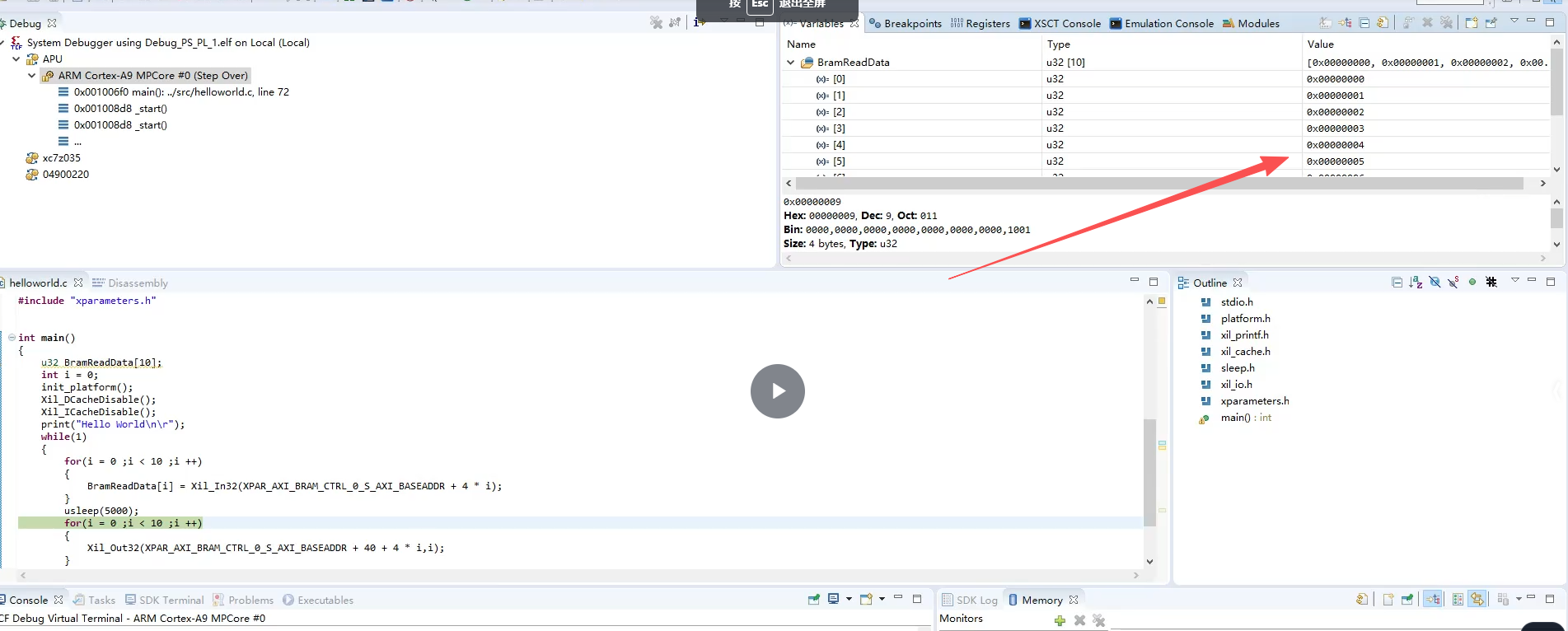 PL先给PS进行写数据,,ps需要读出来,在AXI里面是一个字节一个字节一个地址操作的,PS读入需要把基址给它,+4*i表示下一次是第4个地址。这一次就把这32位取出来。 经过5000us的延迟。ps往里面写数据,基址是从第40个地址进行操作。写入的数据就是i 。