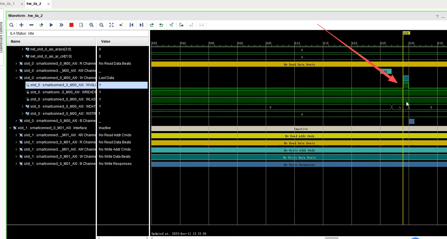 打开VIVADO就可以看到抓的PS的信号以及PL侧的信号了进行查看,给一个地址 写入32位数据,同时地址加4 因为一次增加一个字节地址 送的4个字节给了0地址 就得把0123 地址写进去 下一次32位的地址就是4567