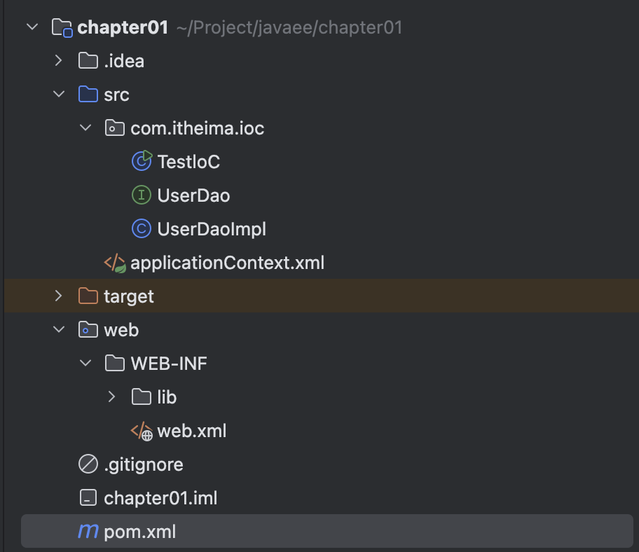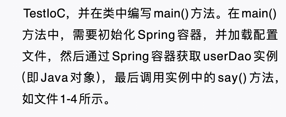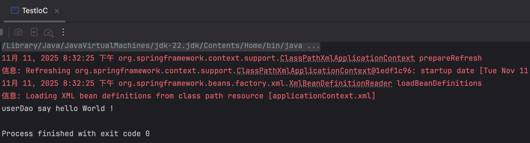 import org.springframework.context.support.ClassPathXmlApplicationContext;public class TestloC {public static void main(String[] args){//1.初始化spring容器,加载配置文件ApplicationContext applicationContext = new ClassPathXmlApplicationContext("applicationContext.xml");//2.通过容器获取userDao实例UserDao userDao = (UserDao)applicationContext.getBean("userDao");//调用实例中的say()方法userDao.say();}
