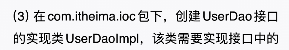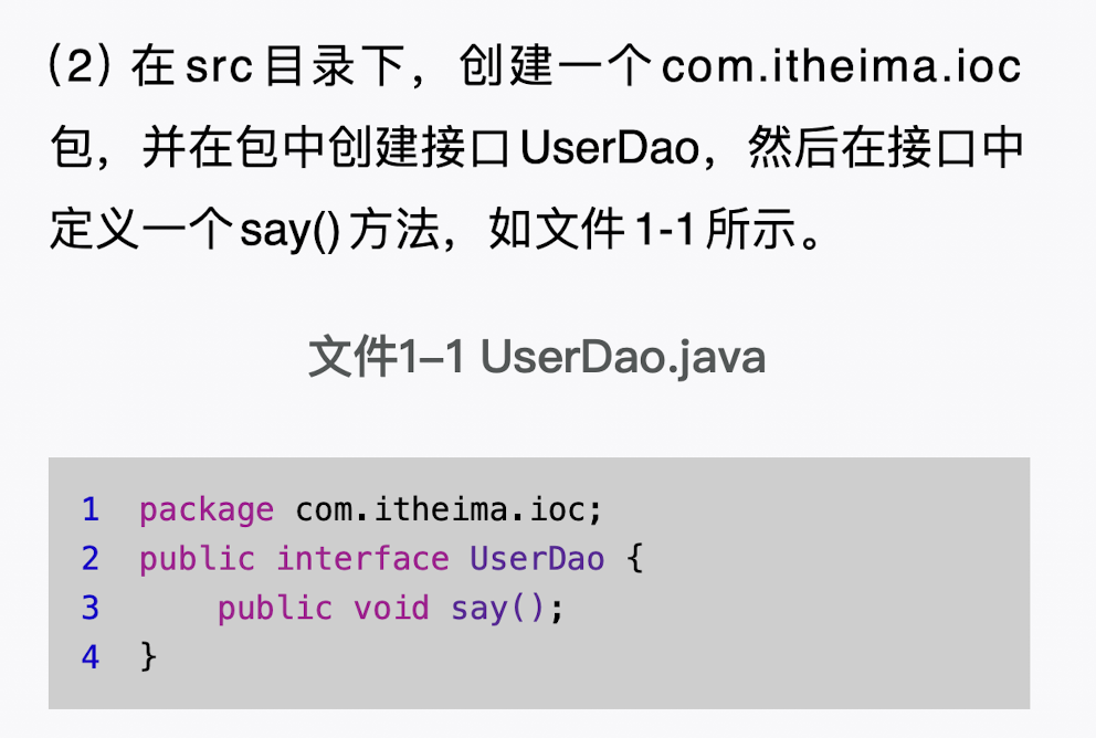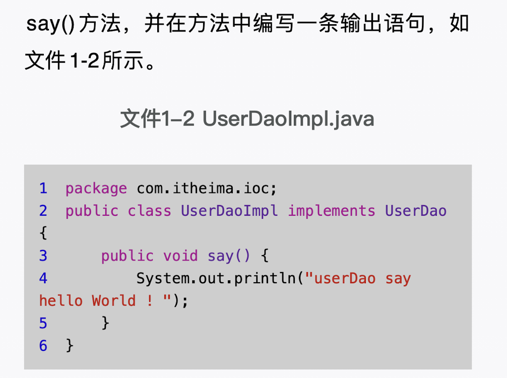 package com.itheima.ioc;public class UserDaoImpl implements UserDao {public void say() {System.out.println("userDao say hello World ! ");}