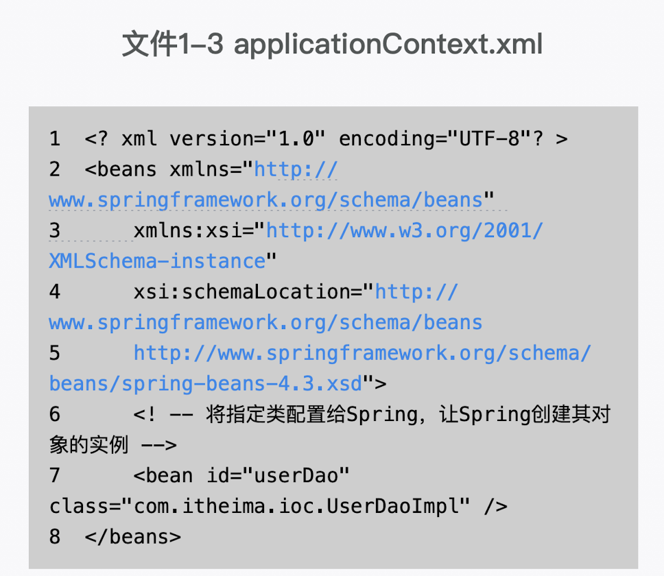 <beans xmlns="http://www.springframework.org/schema/beans"xmlns:xsi="http://www.w3.org/2001/XMLSchema-instance"xsi:schemaLocation="http://www.springframework.org/schema/beanshttp://www.springframework.org/schema/beans/spring-beans-4.3.xsd"><bean id="userDao" class="com.itheima.ioc.UserDaoImpl" />