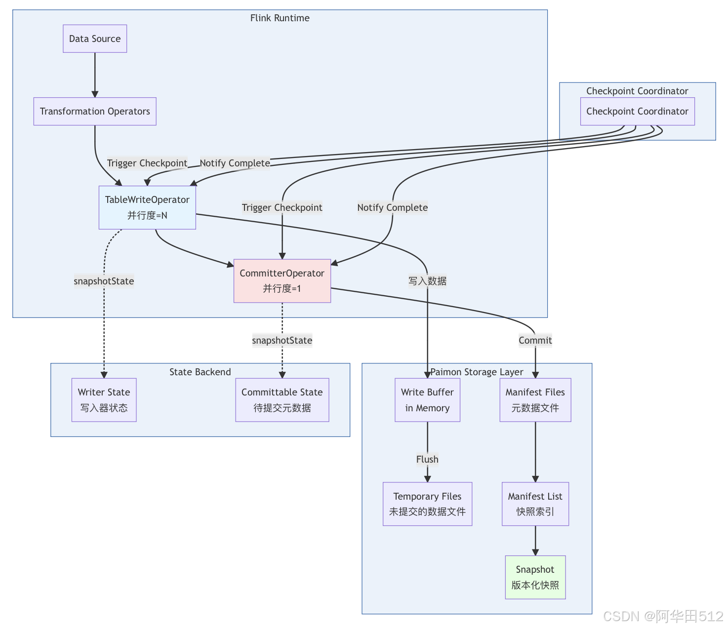 Committer Operator(提交算子):负责收集 Committable、持久化待提交队列、在 checkpoint 完成后执行最终 commit(将元数据写入 Manifest 与 Sna