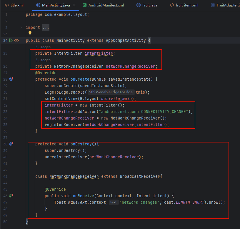 定义了一个NetWorkChangeReceiver的内部类继承BroadcastReceiver并重写了onReceive方法