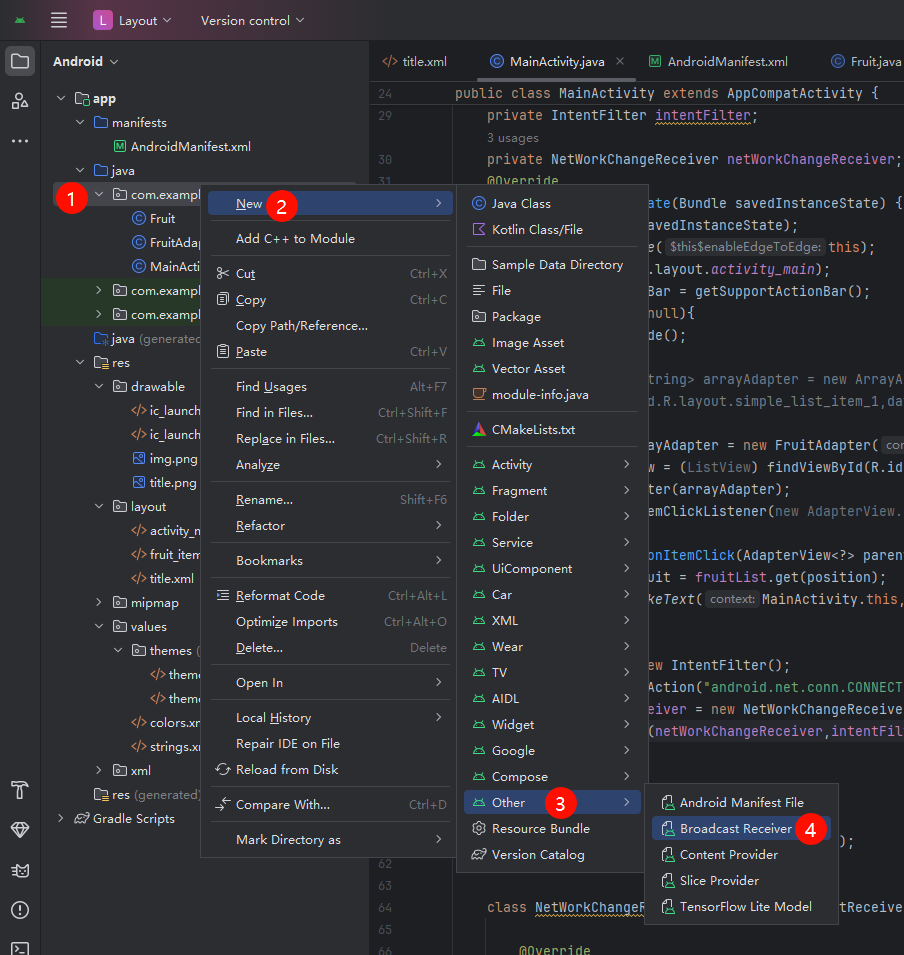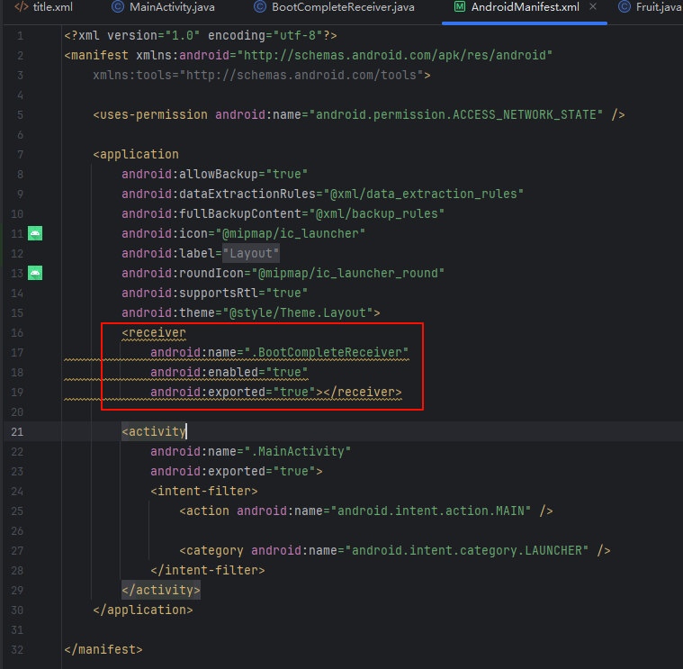 同时由于我们使用的Android Studio快捷方式创建的广播接收器,所以可以在AndroidManifest.xml文件中找到自动注册的代码