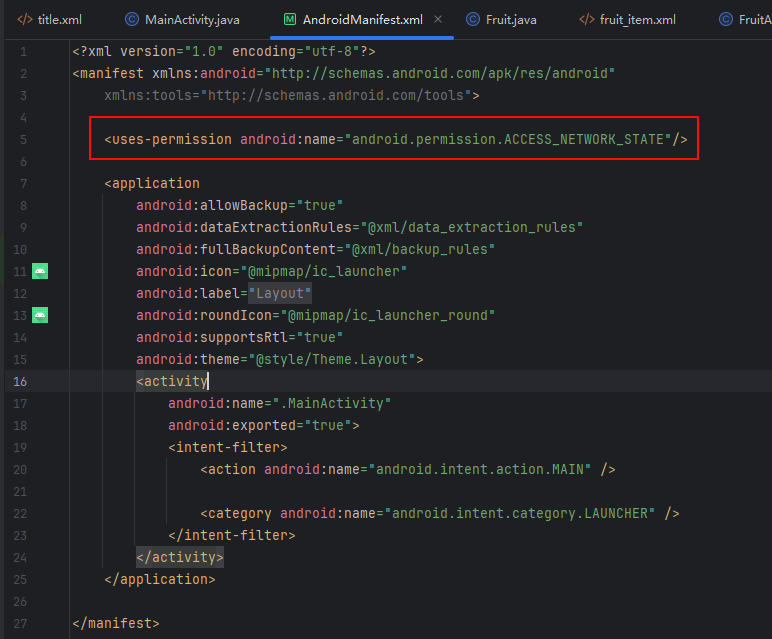 然后在AndroidManifest.xml文件中声明权限