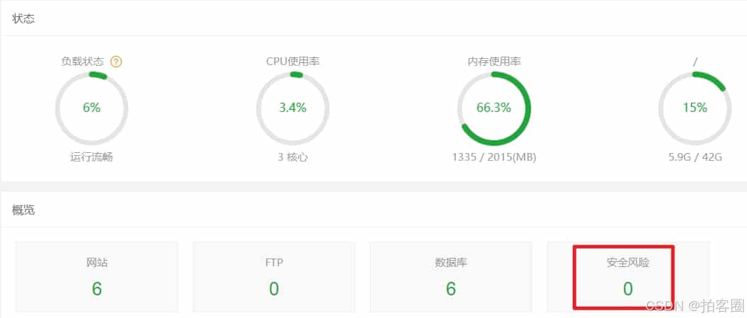 3.再回到宝塔面板首页,重新检测安全风险,发现已解决
