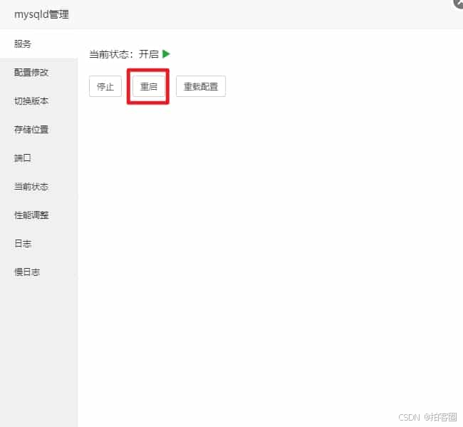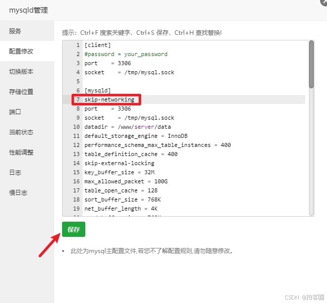 - 到宝塔后台,找到MySQL,点设置,配置修改。