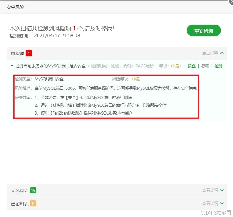 宝塔面首页提示有1个安全风险。说是:【当前MySQL端口: 3306,可被任意服务器访问,这可能导致MySQL被暴力破解,存在安全隐患】。暴力破解?这也太不安全了。于是网上找答案,找了很久也没找到相似的问题和解决方案。最后在一个远古的帖子中找到了解决此问题的蛛丝马迹,经过验证方法有效。特意记录下来给遇到相同问题的朋友。