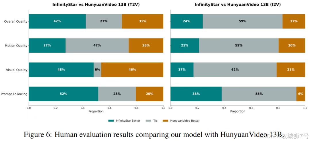 (1)质量:在VBench基准上获得83.74分,超越了参数量更大的扩散模型HunyuanVideo。在与后者的人工双盲评测中,无论是在文本遵循度、视觉质量还是运动平滑度上,InfinityStar都全面领先。